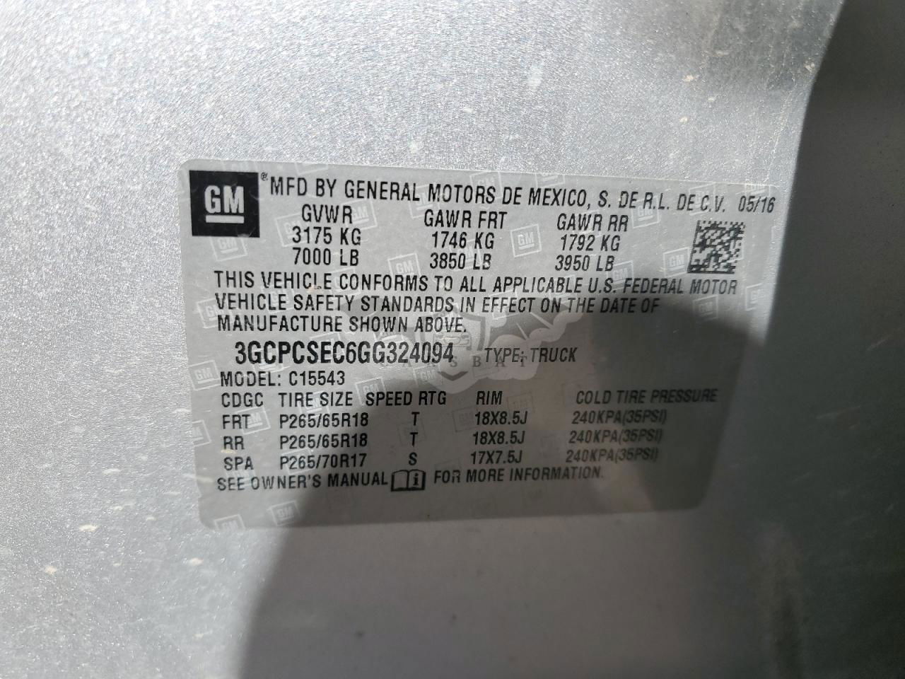 • VIN: 3GCPCSEC6GG324094