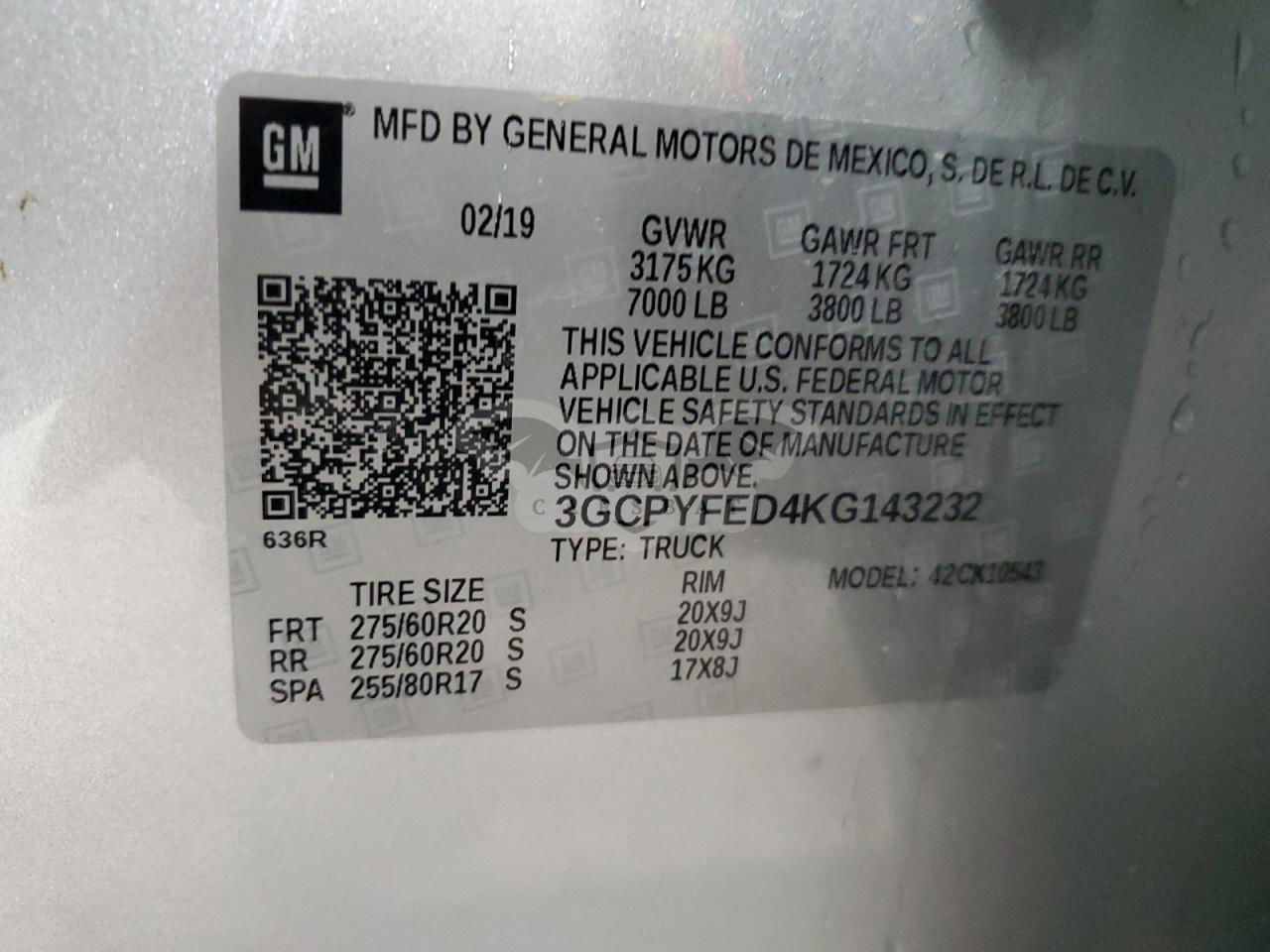 • VIN: 3GCPYFED4KG143232
