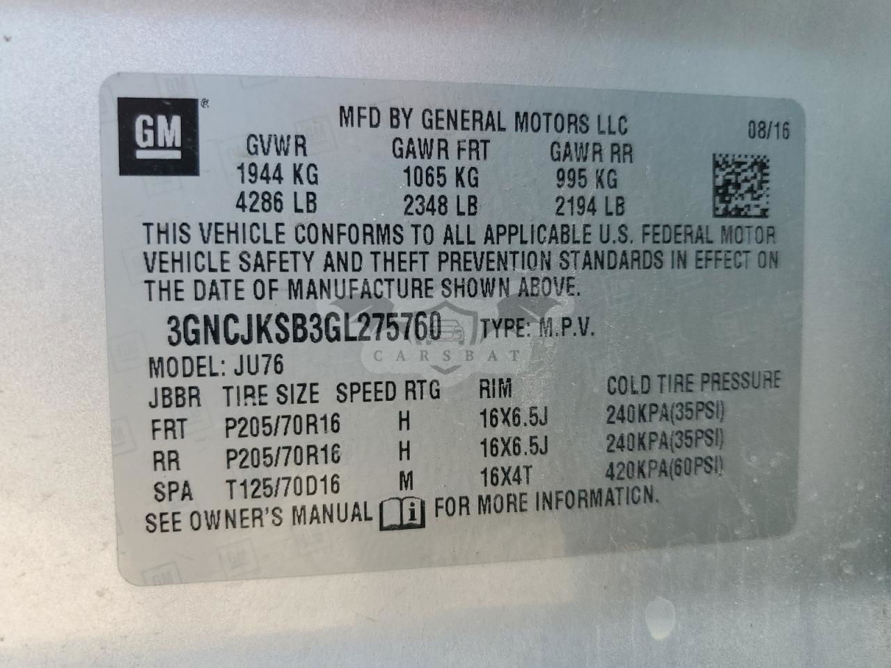 • VIN: 3GNCJKSB3GL275760