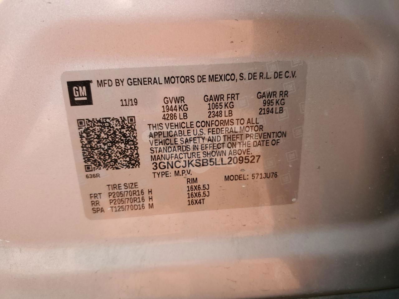 • VIN: 3GNCJKSB5LL209527