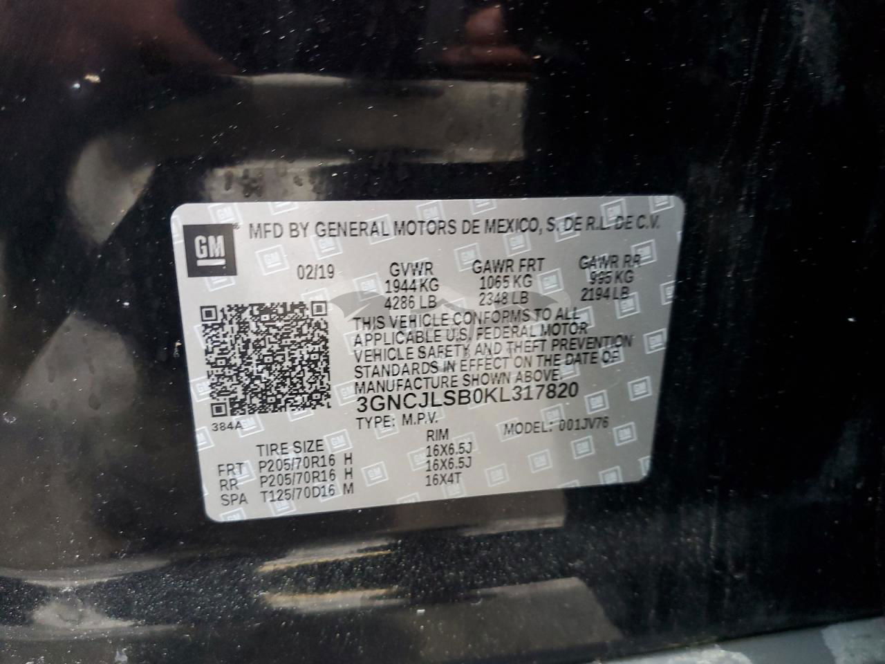 • VIN: 3GNCJLSB0KL317820