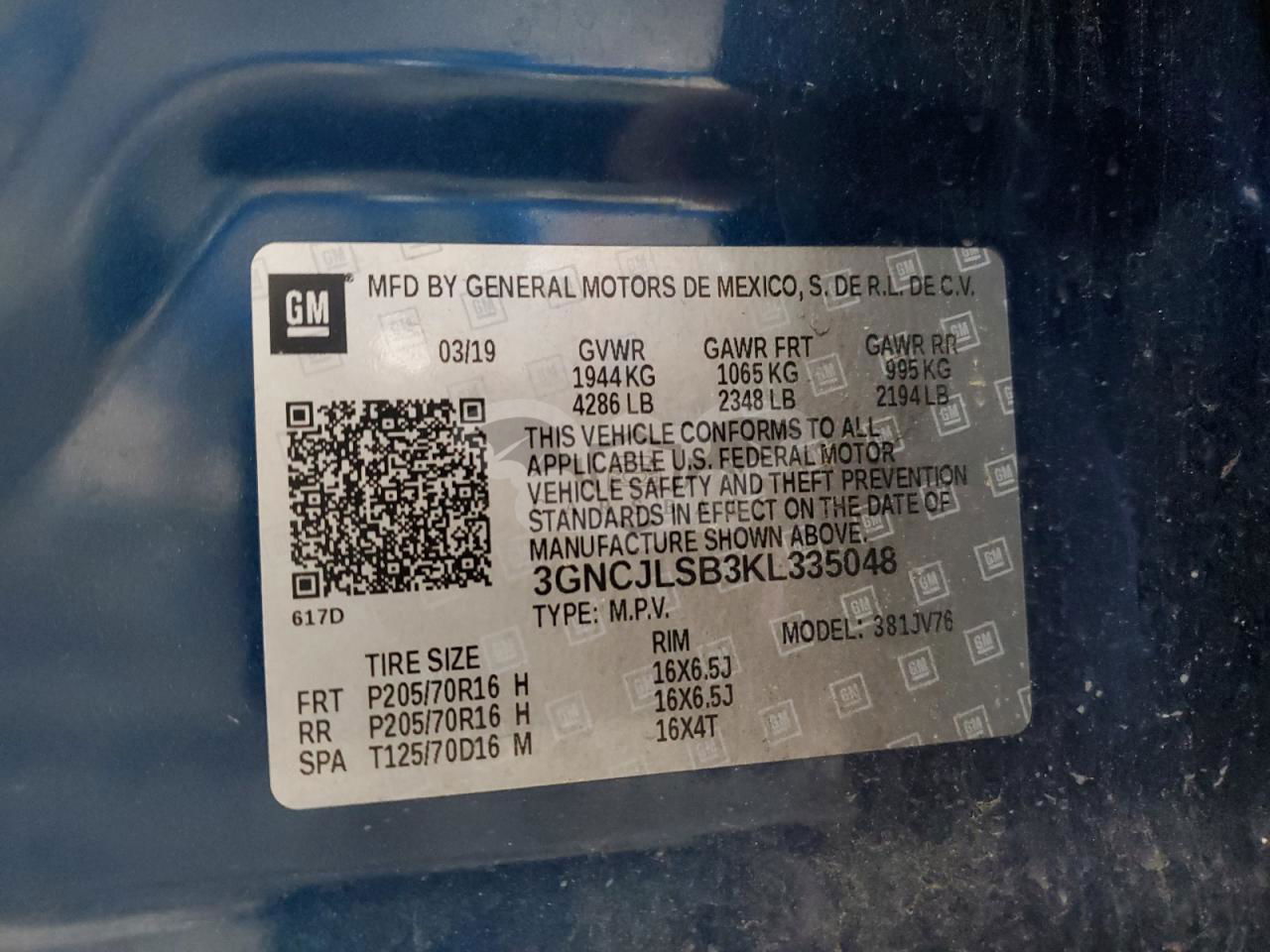 • VIN: 3GNCJLSB3KL335048