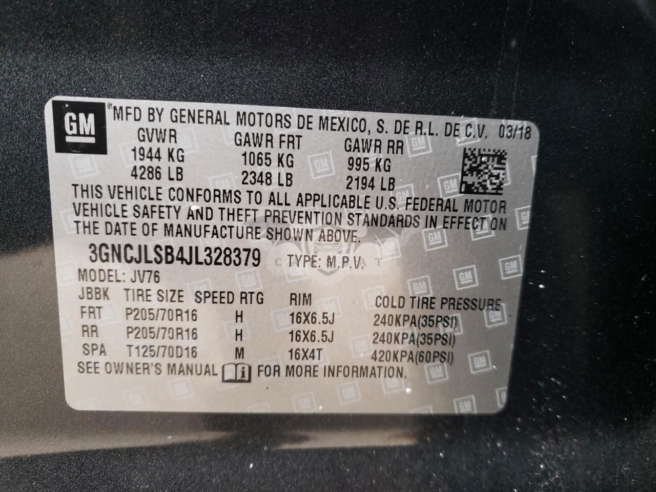 • VIN: 3GNCJLSB4JL328379