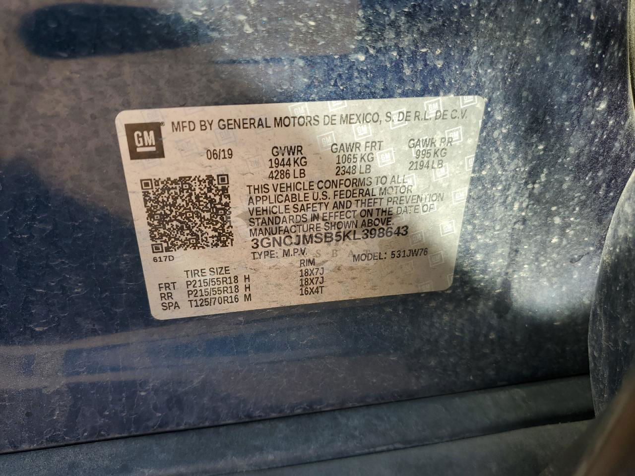 • VIN: 3GNCJMSB5KL398643