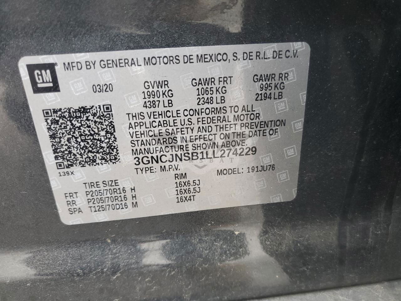 • VIN: 3GNCJNSB1LL274229