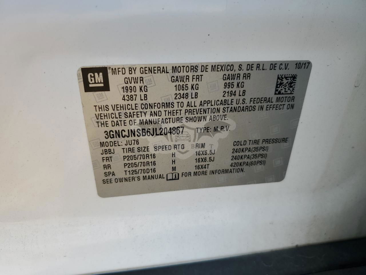 • VIN: 3GNCJNSB6JL204867