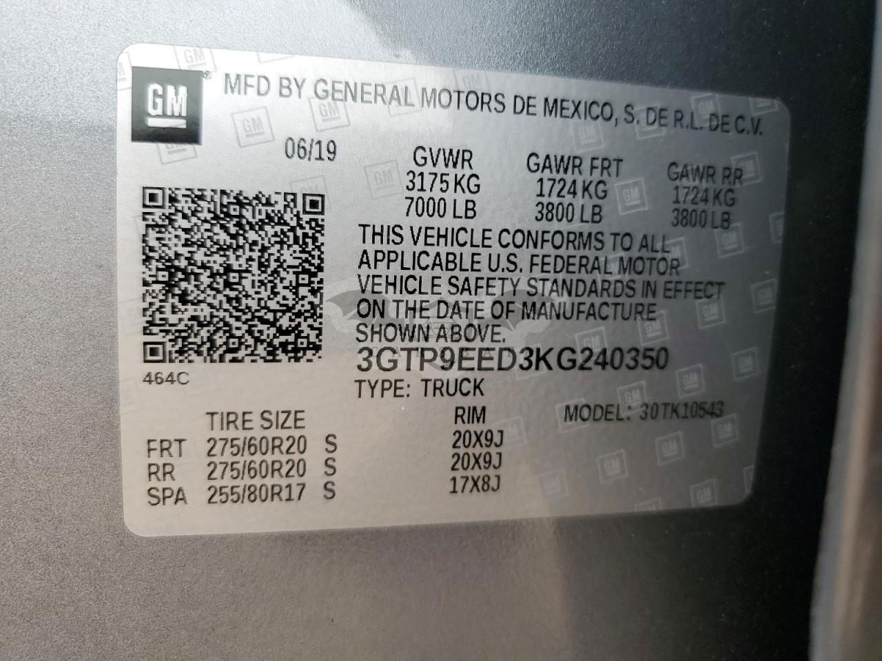 • VIN: 3GTP9EED3KG240350