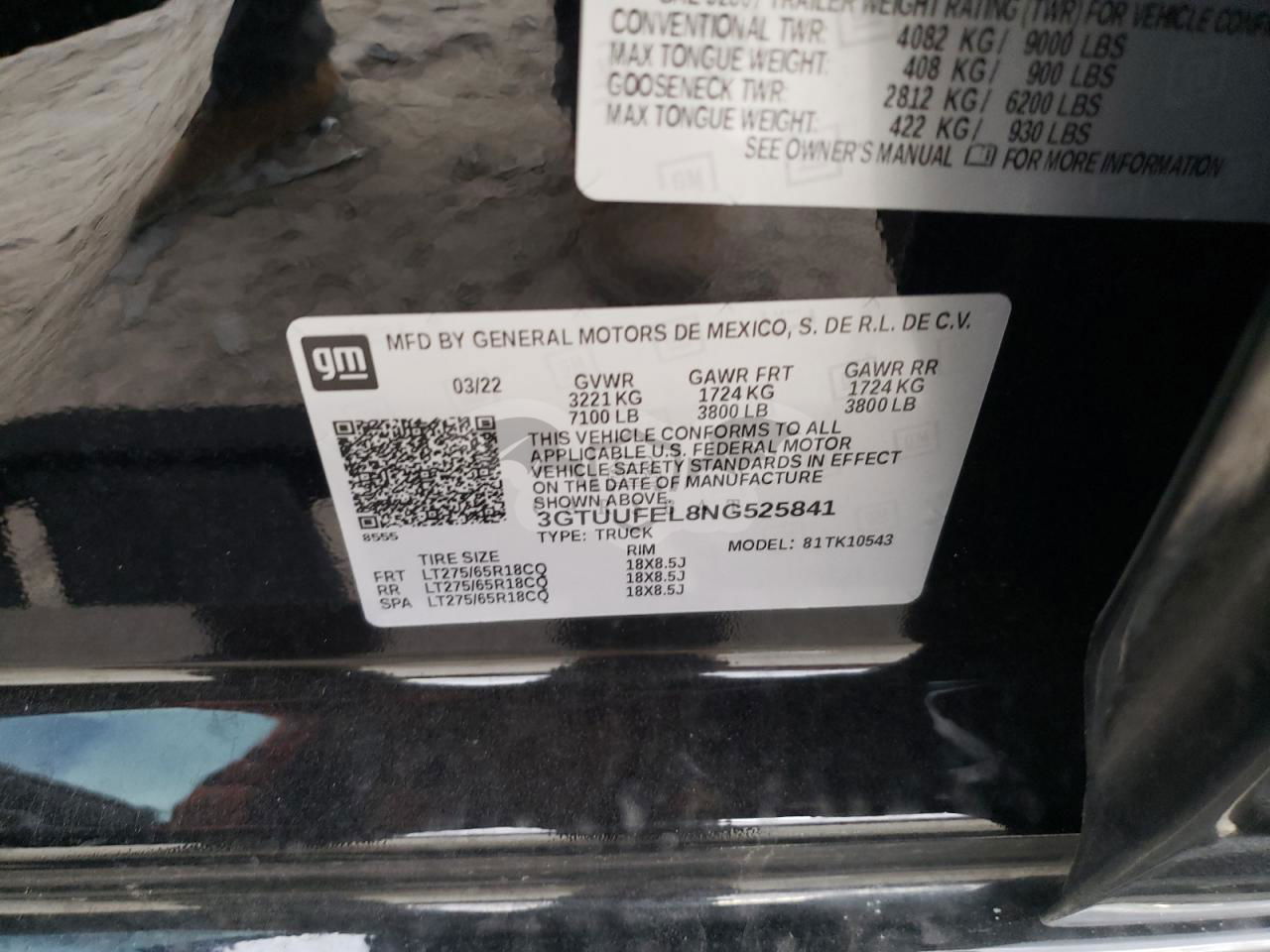 • VIN: 3GTUUFEL8NG525841