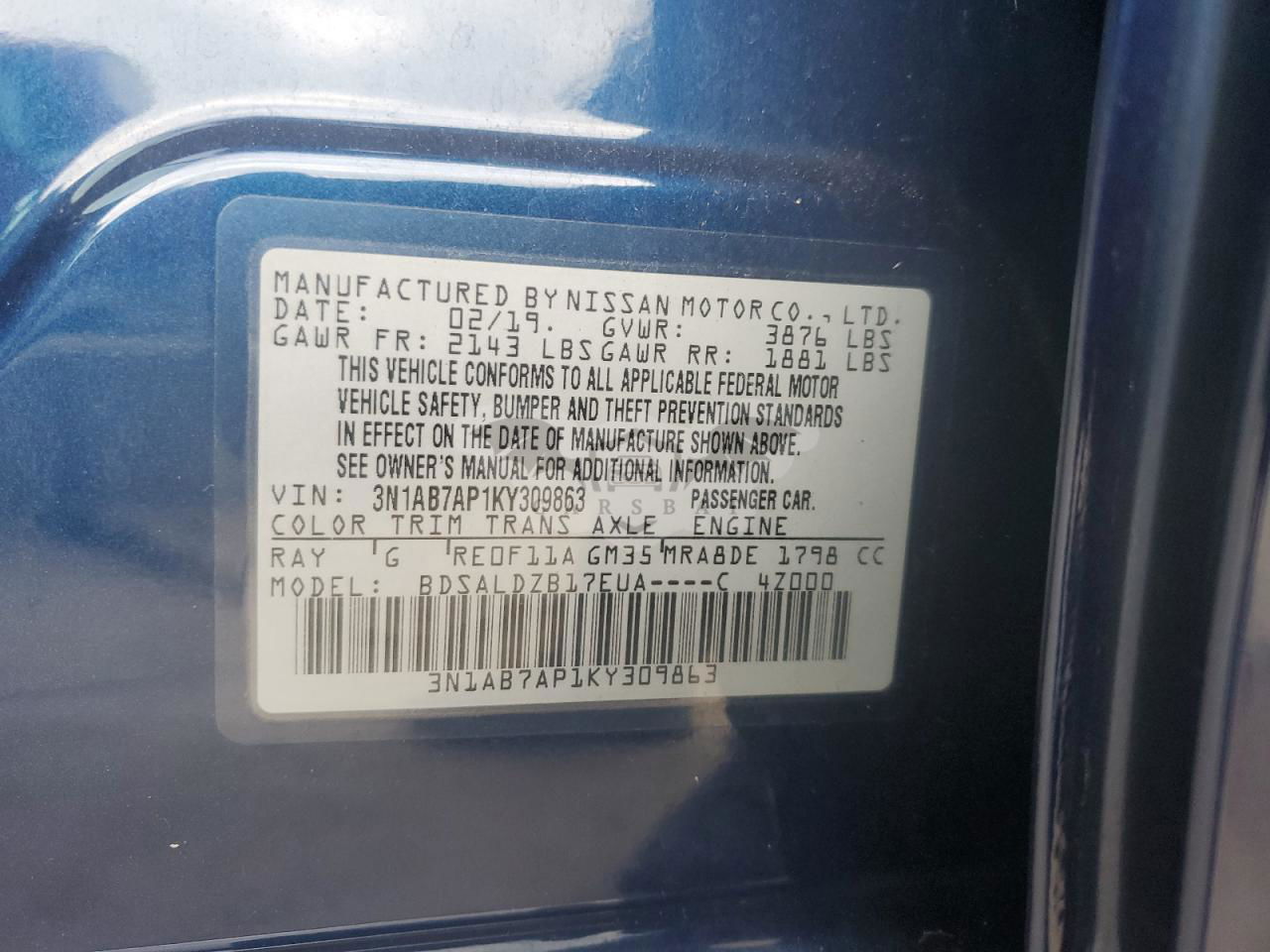 • VIN: 3N1AB7AP1KY309863