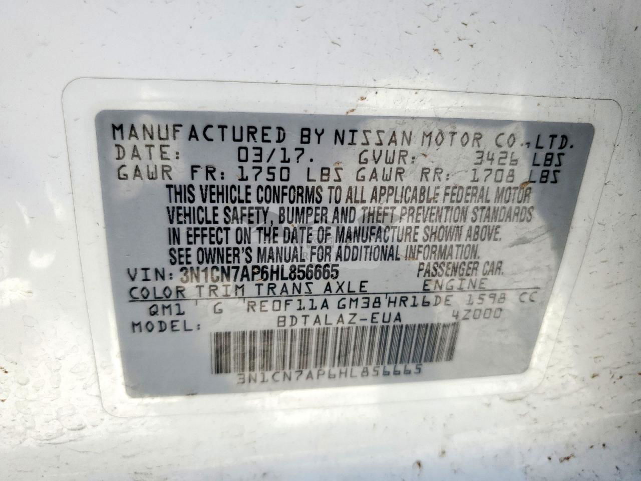 • VIN: 3N1CN7AP6HL856665