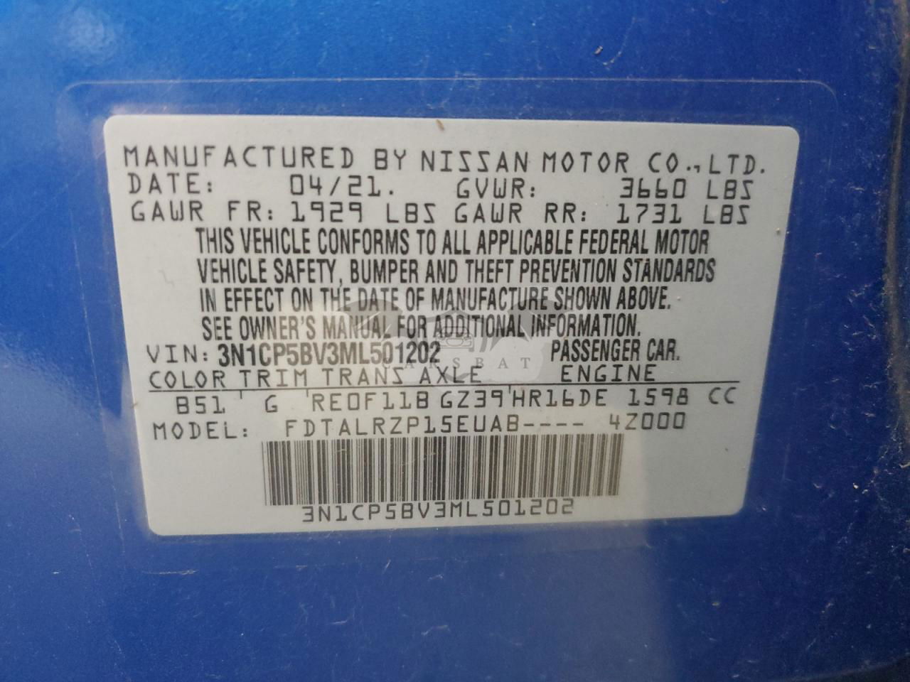 • VIN: 3N1CP5BV3ML501202