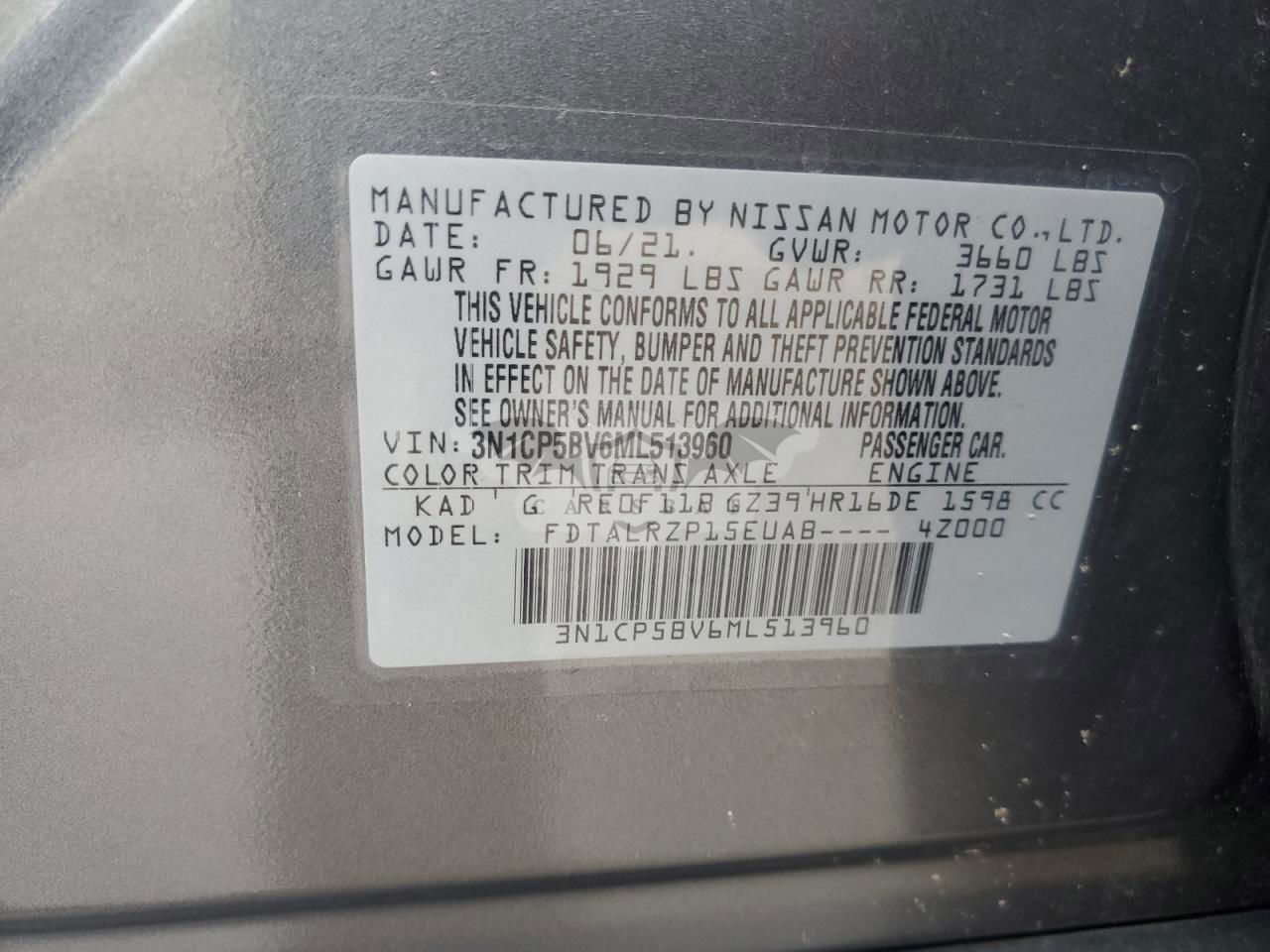 • VIN: 3N1CP5BV6ML513960