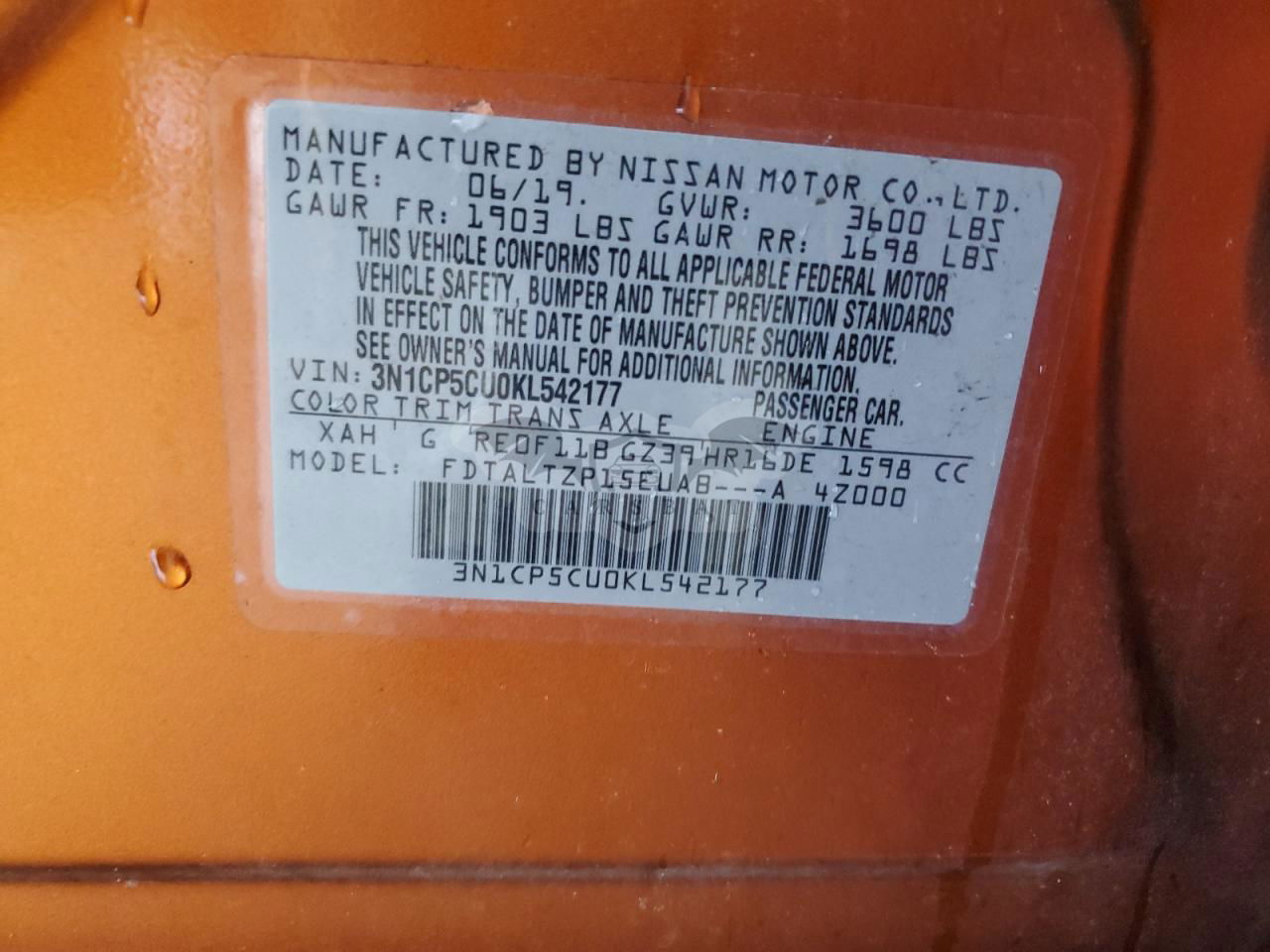 • VIN: 3N1CP5CU0KL542177