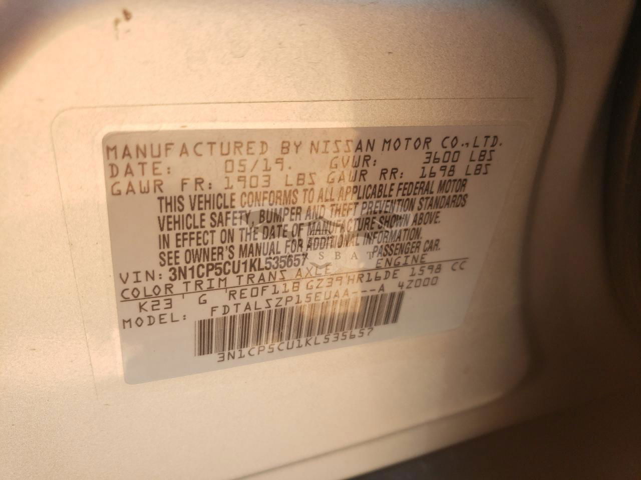 • VIN: 3N1CP5CU1KL535657