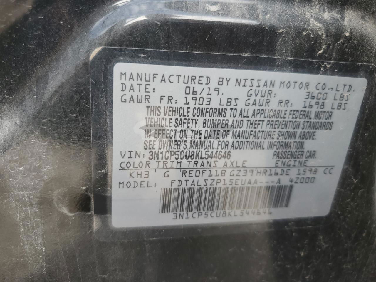 • VIN: 3N1CP5CU8KL544646