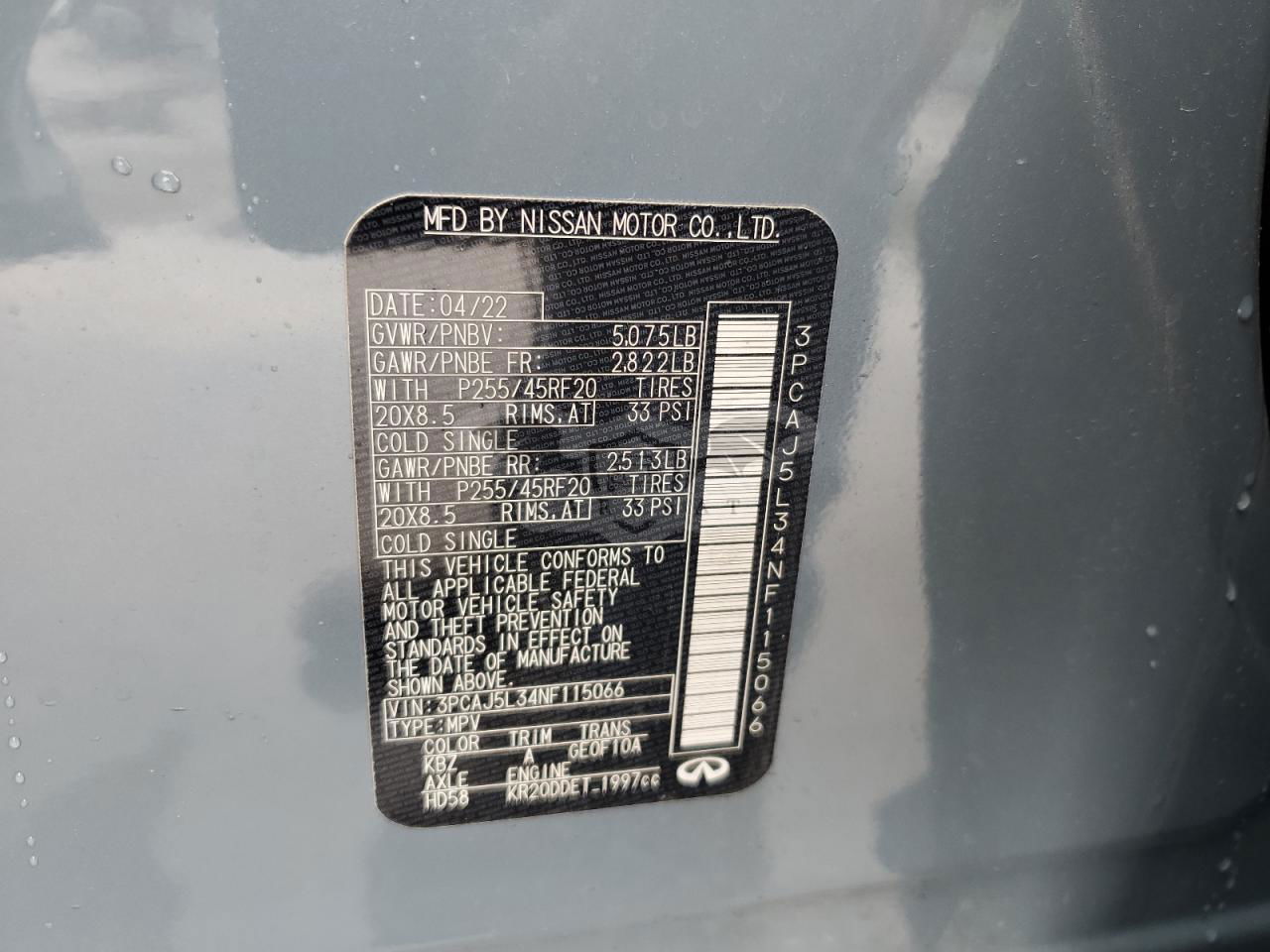 Niebieski Infiniti QX50 SENSORY 2.0L 4 2022 roku | Benzyna