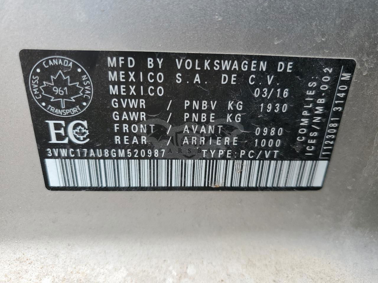 • VIN: 3VWC17AU8GM520987