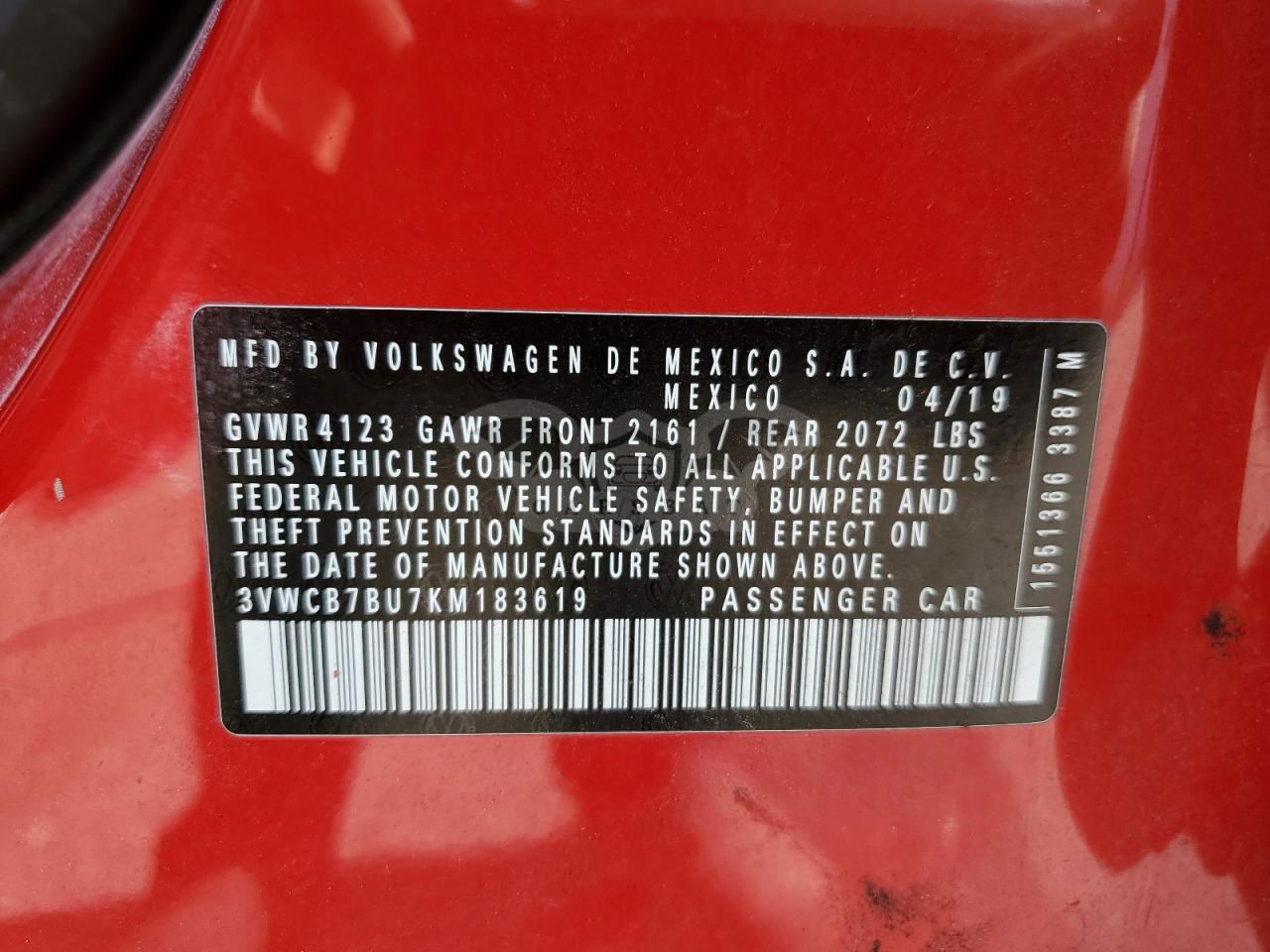 • VIN: 3VWCB7BU7KM183619