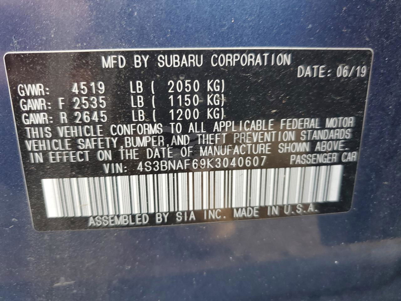 • VIN: 4S3BNAF69K3040607
