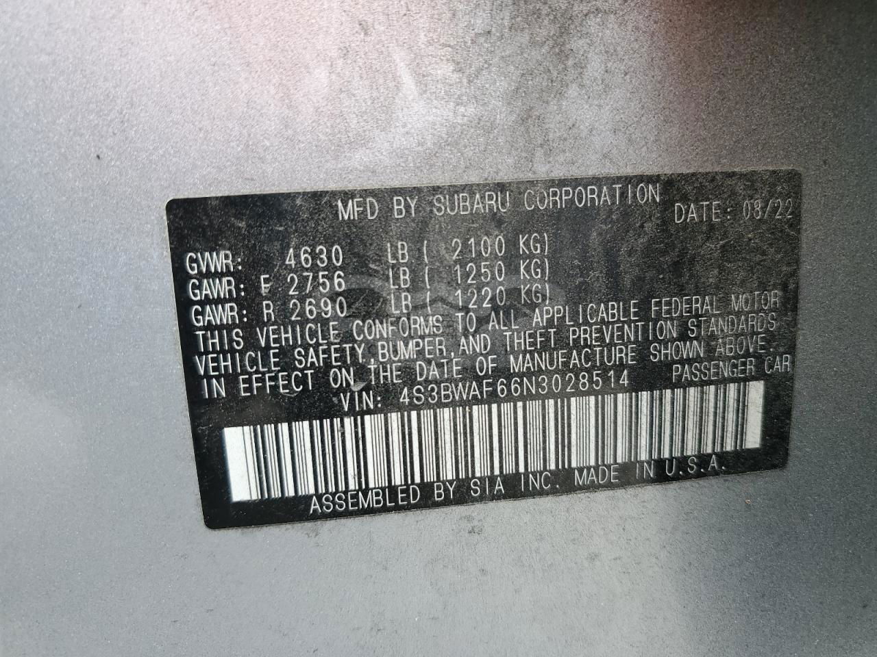 • VIN: 4S3BWAF66N3028514