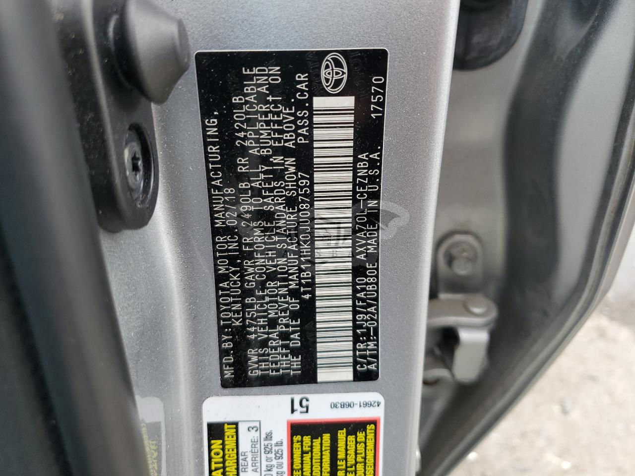 • VIN: 4T1B11HK0JU087597