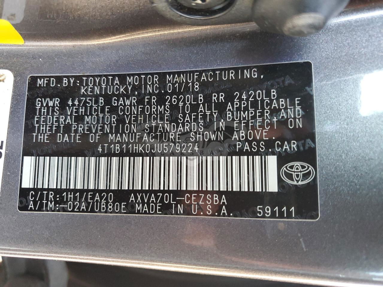 • VIN: 4T1B11HK0JU579224