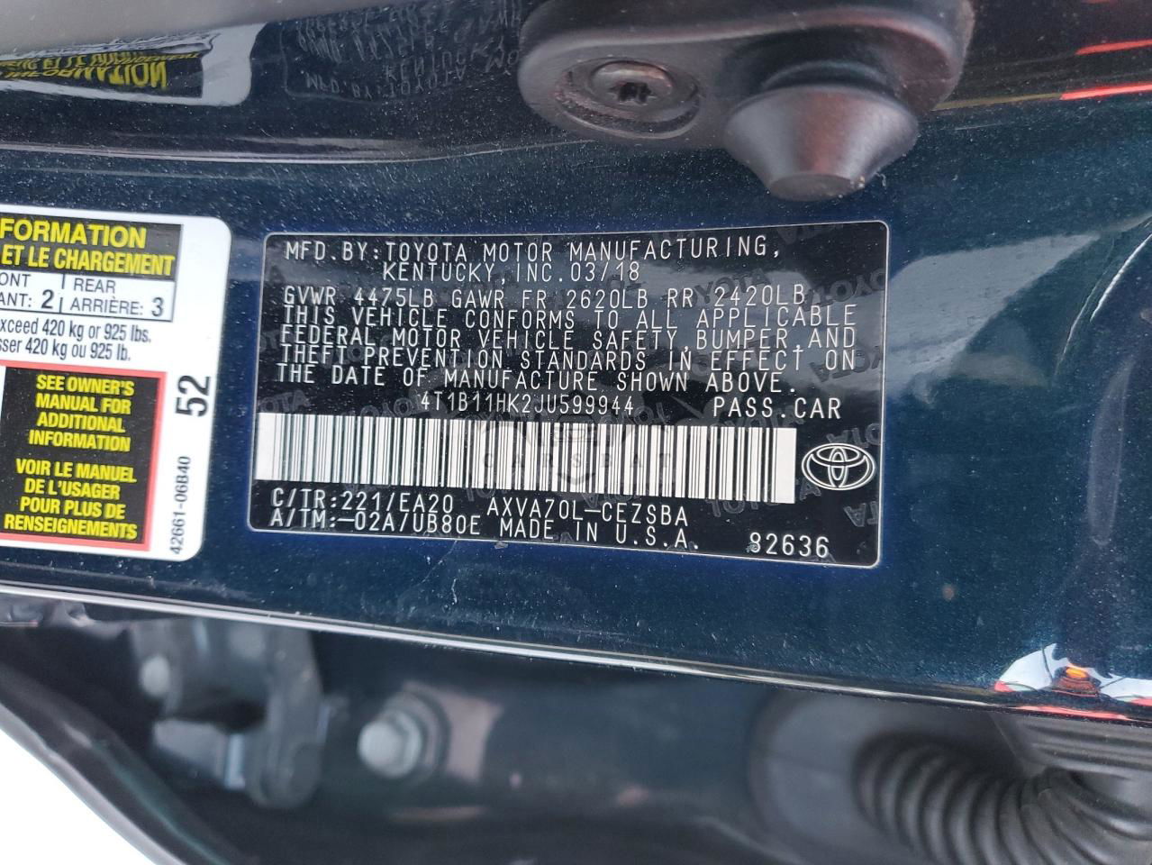 • VIN: 4T1B11HK2JU599944