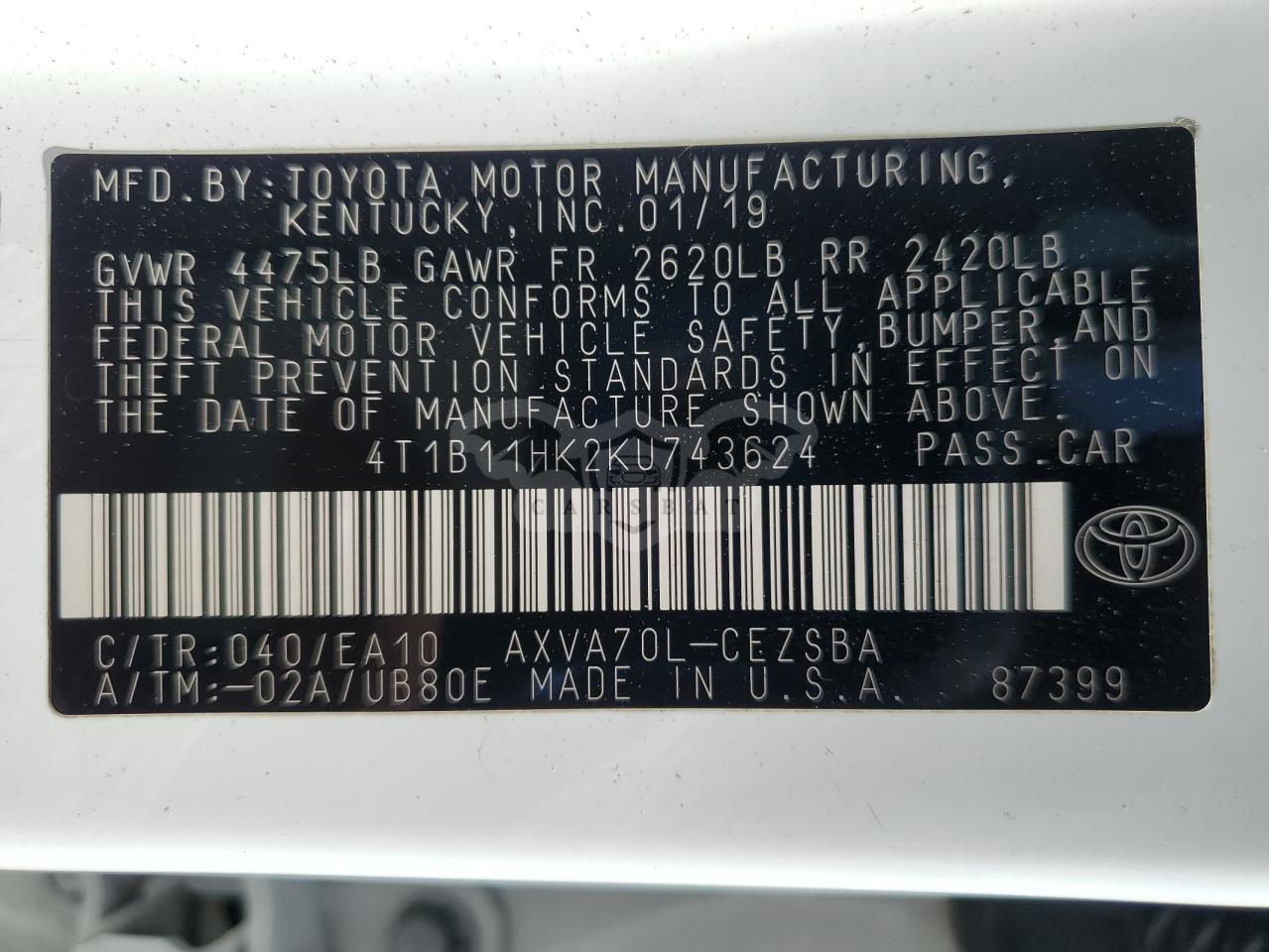 • VIN: 4T1B11HK2KU743624