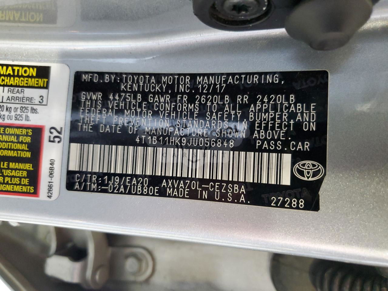 • VIN: 4T1B11HK9JU056848