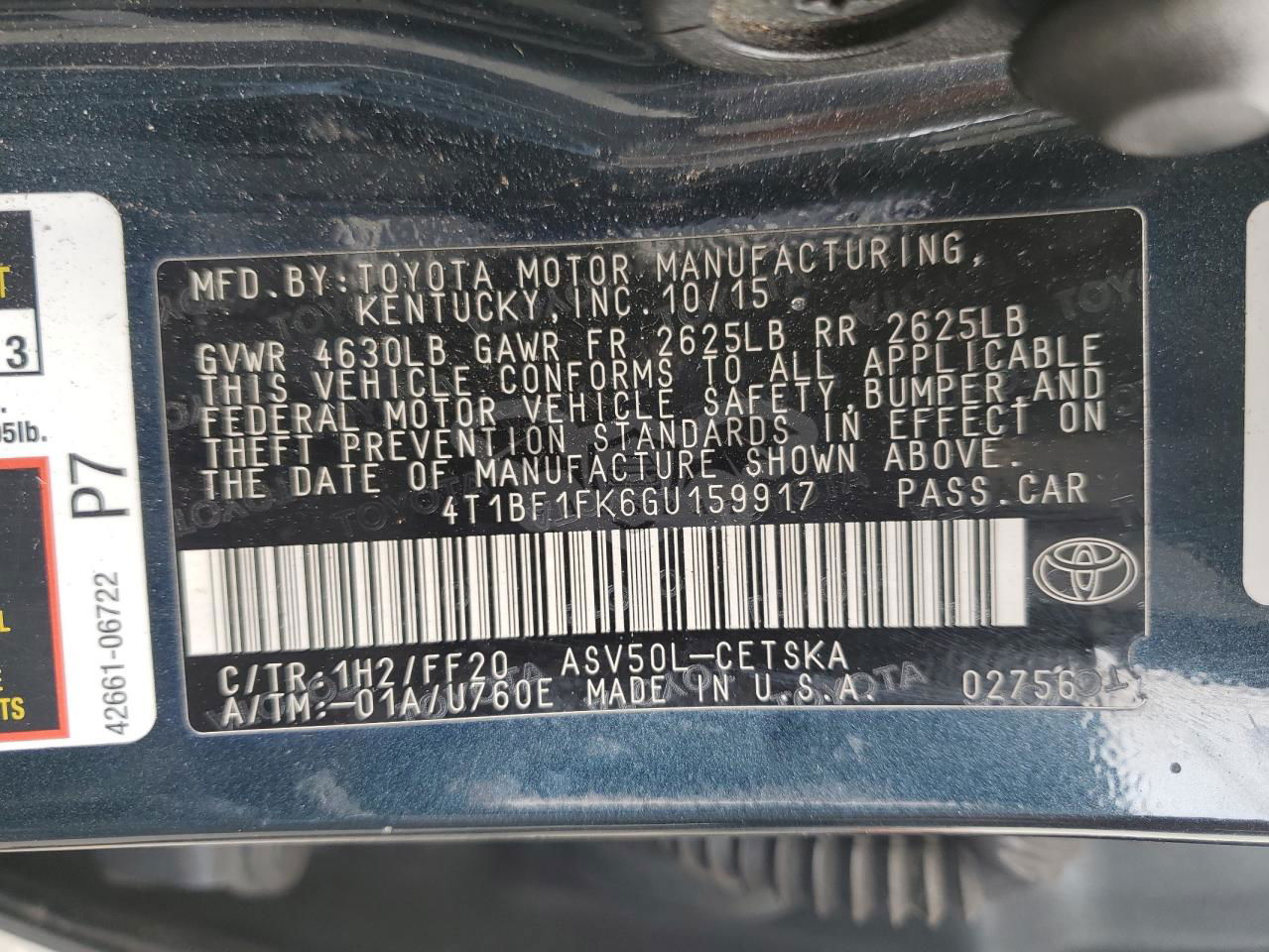 • VIN: 4T1BF1FK6GU159917