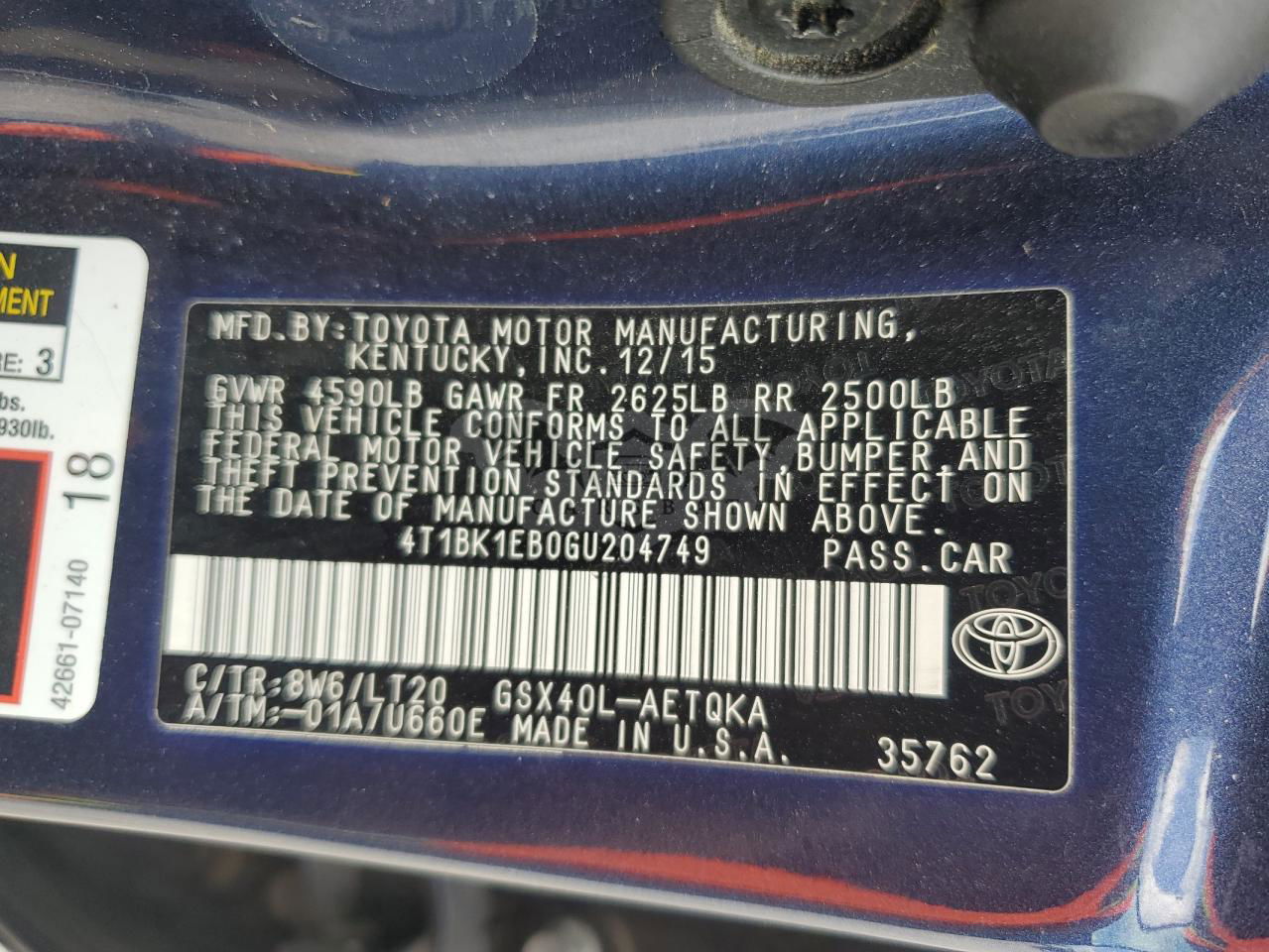 • VIN: 4T1BK1EB0GU204749