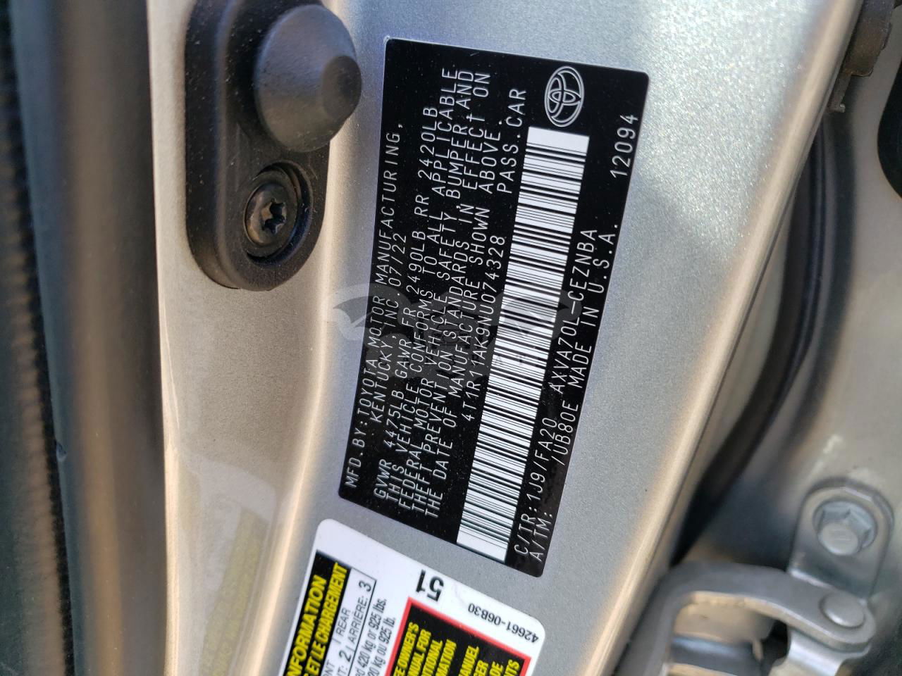 • VIN: 4T1R11AK9NU074328