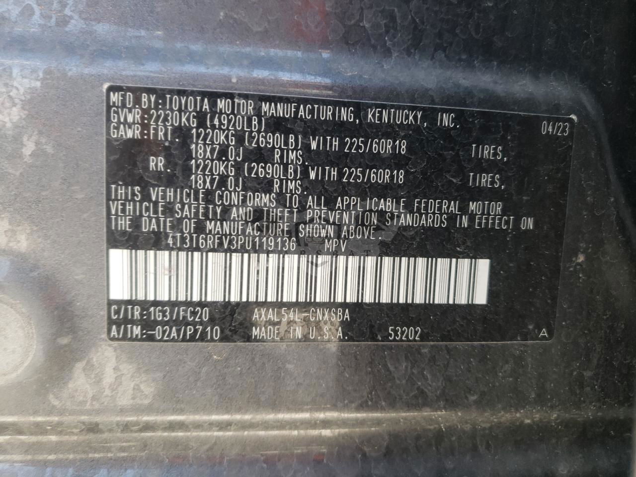 • VIN: 4T3T6RFV3PU119136