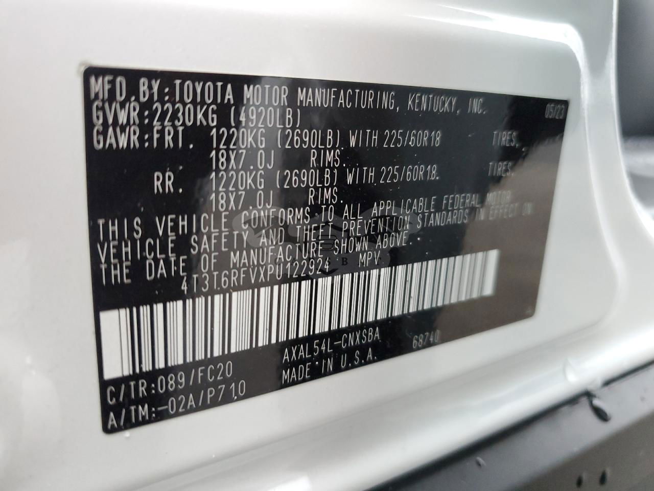 • VIN: 4T3T6RFVXPU122924
