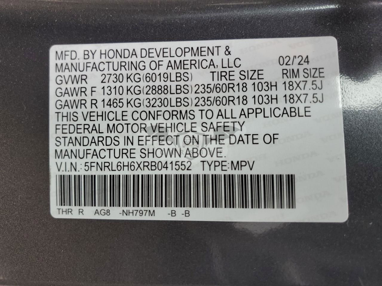 • VIN: 5FNRL6H6XRB041552