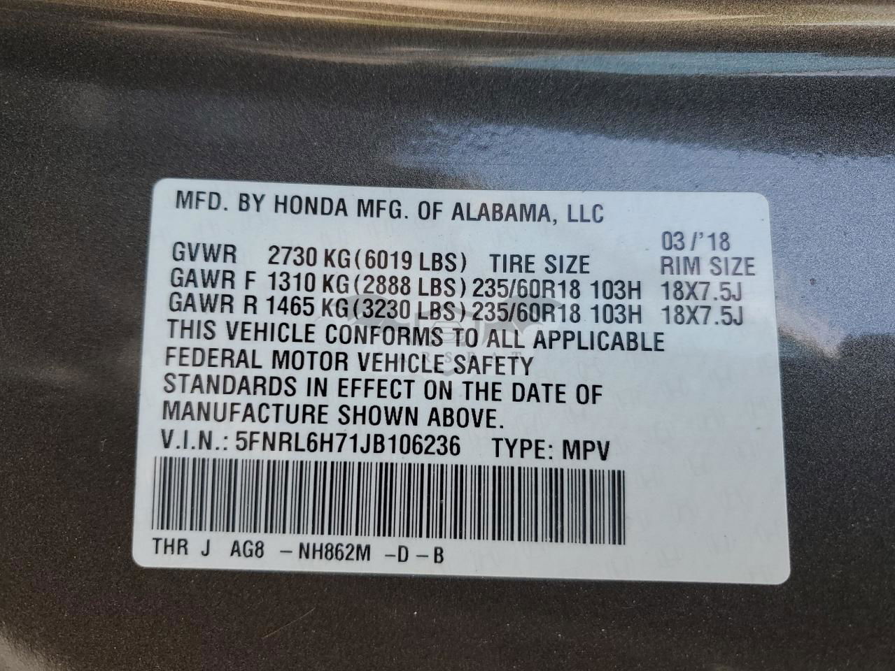 • VIN: 5FNRL6H71JB106236