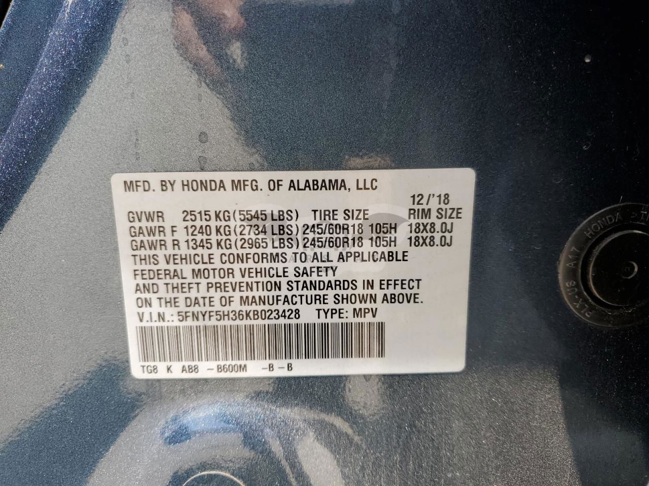• VIN: 5FNYF5H36KB023428