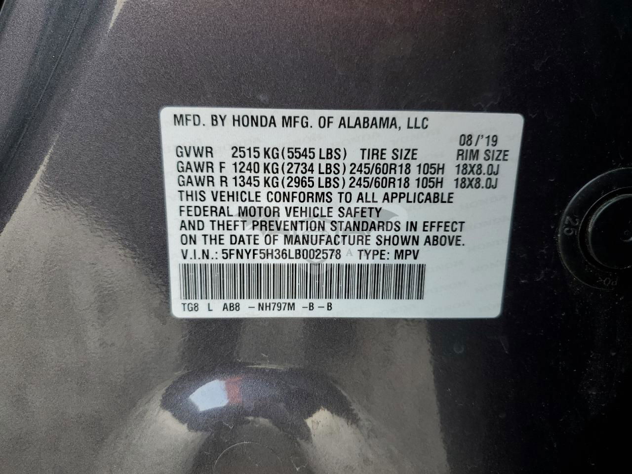 • VIN: 5FNYF5H36LB002578