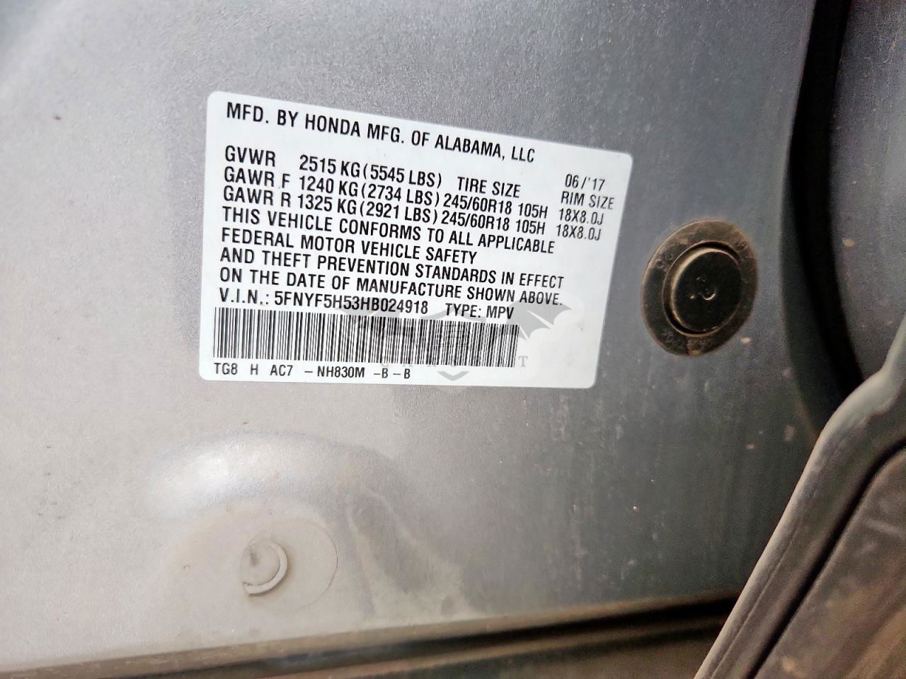 • VIN: 5FNYF5H53HB024918