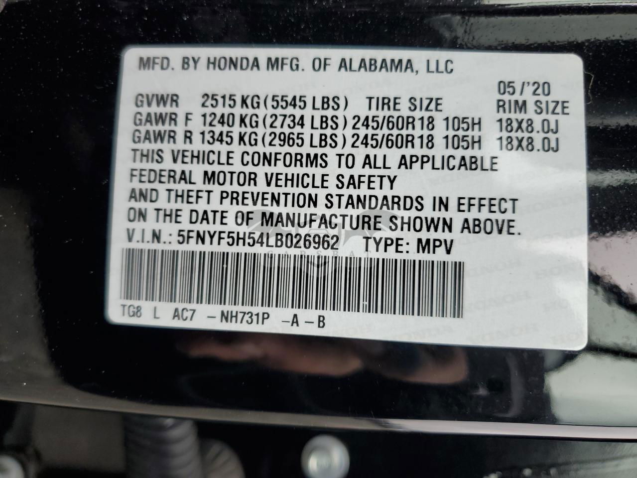 • VIN: 5FNYF5H54LB026962