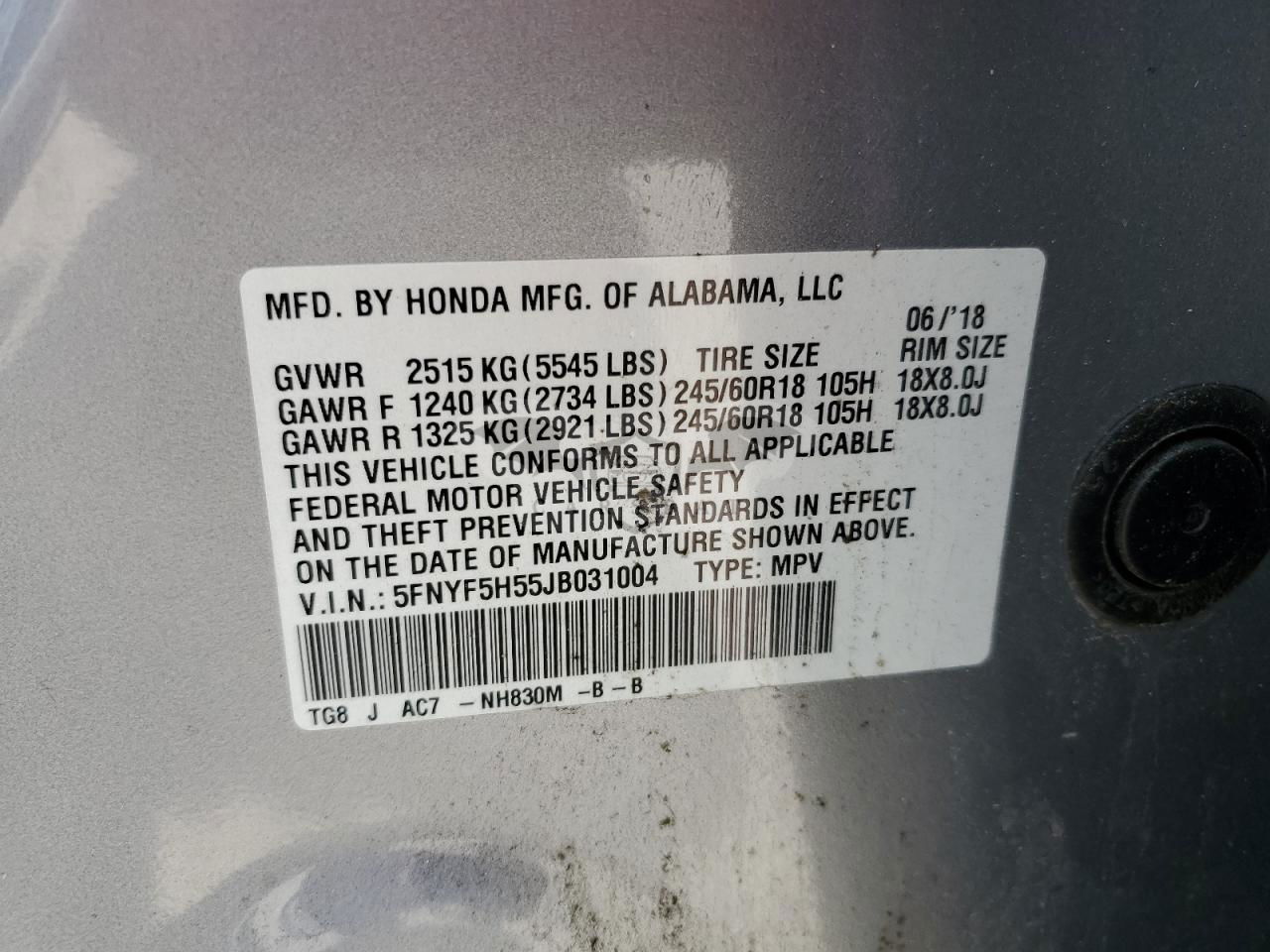 • VIN: 5FNYF5H55JB031004