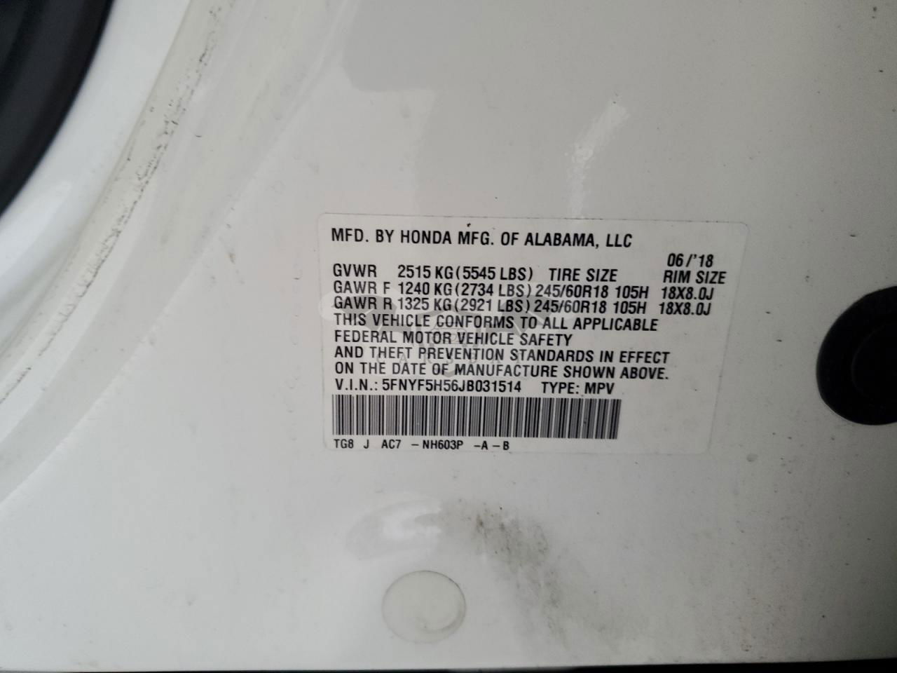 • VIN: 5FNYF5H56JB031514