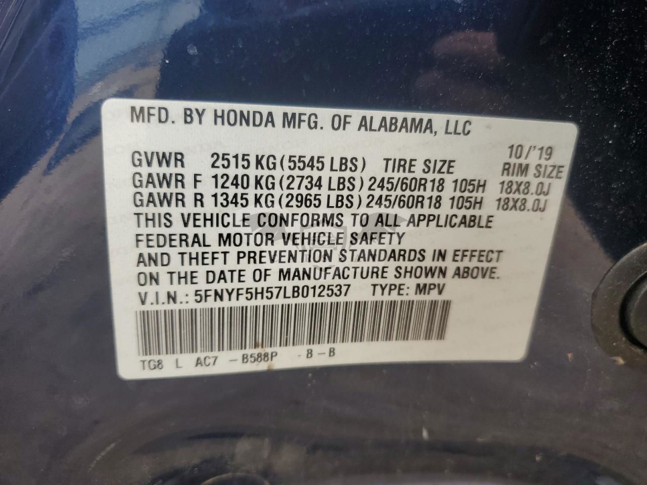 • VIN: 5FNYF5H57LB012537