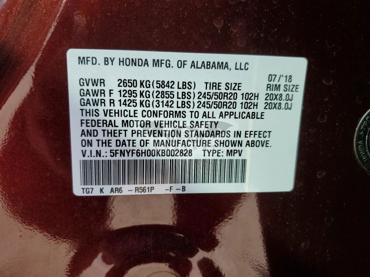 • VIN: 5FNYF6H00KB002828