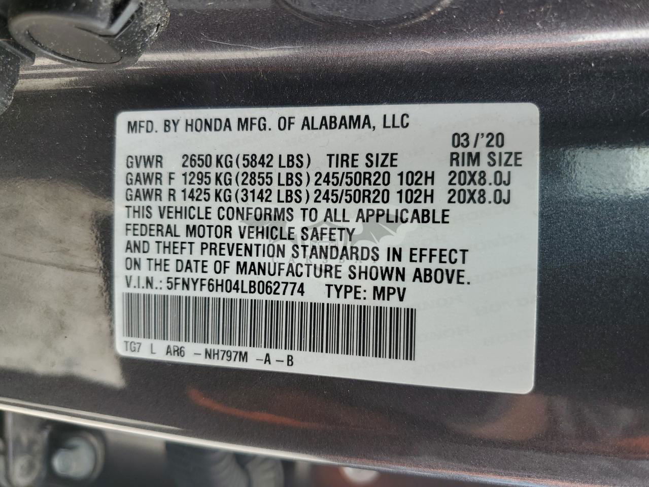 • VIN: 5FNYF6H04LB062774