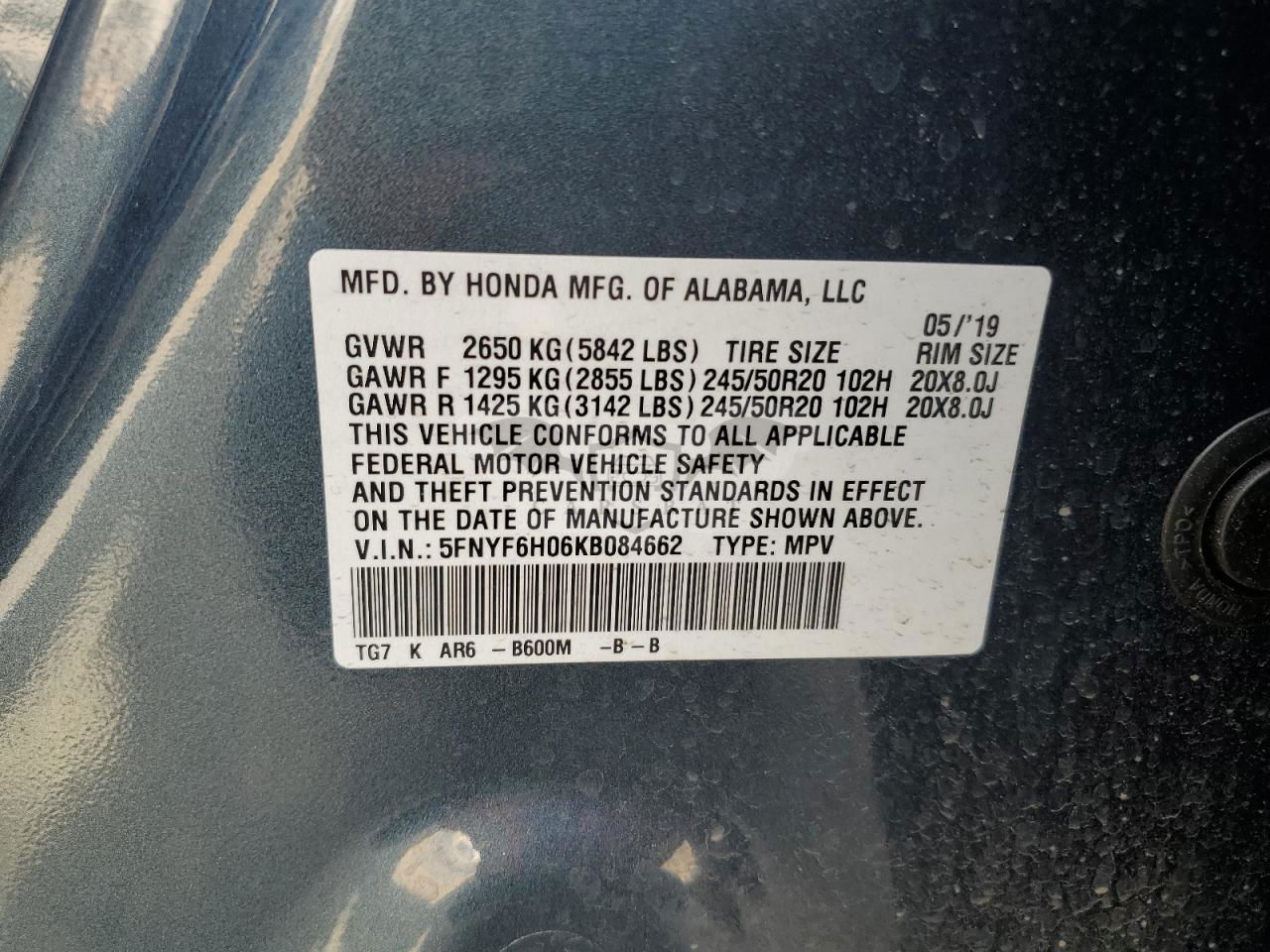 • VIN: 5FNYF6H06KB084662
