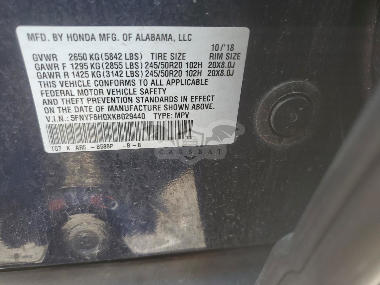 • VIN: 5FNYF6H0XKB029440