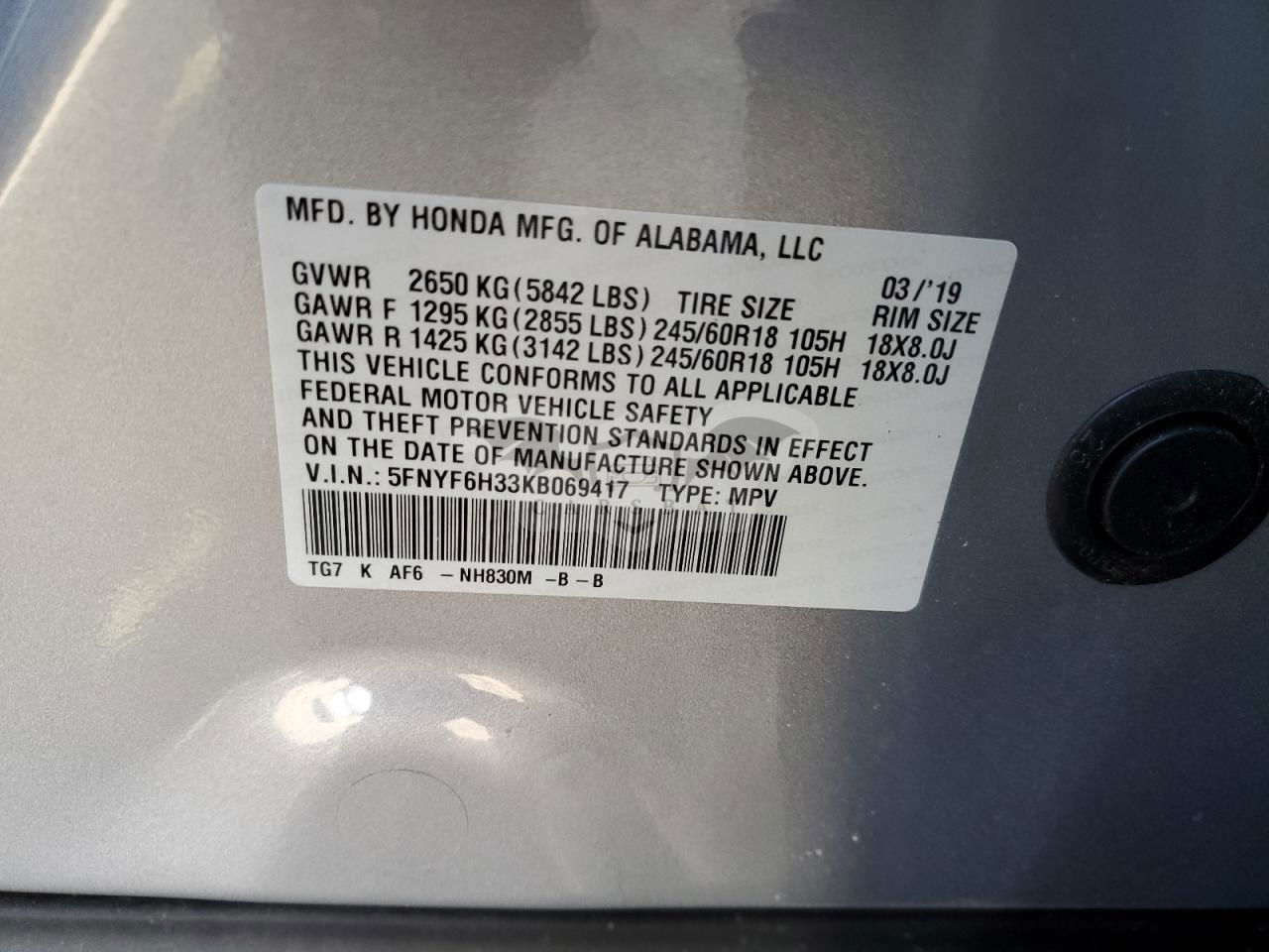 • VIN: 5FNYF6H33KB069417