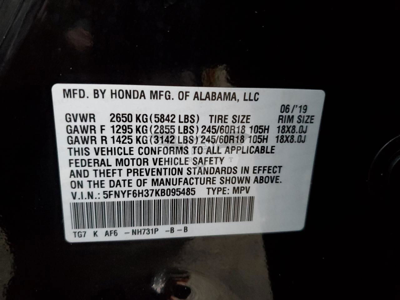 • VIN: 5FNYF6H37KB095485