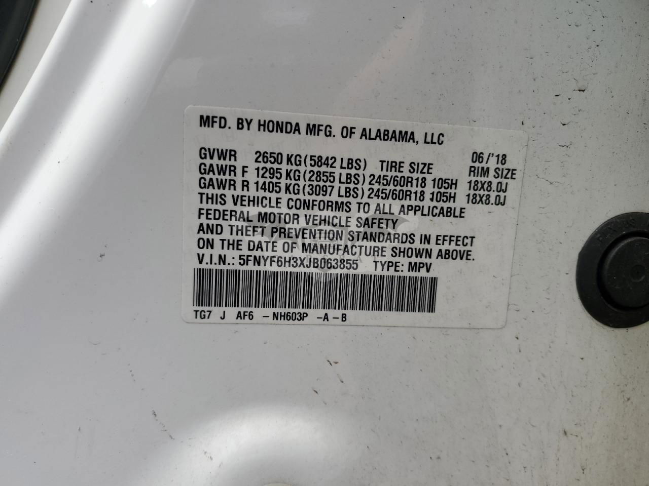 • VIN: 5FNYF6H3XJB063855